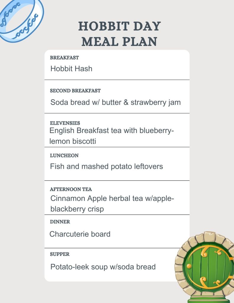 With a loose idea of what foods the hobbits ate, it was time to craft our schedule. With 7 distinct meals typical to any hobbit’s day (and a full time job I was still committed to that day), and around 14 waking hours, I took some time to plan out when I was going to eat to space things out in a more appropriate way: