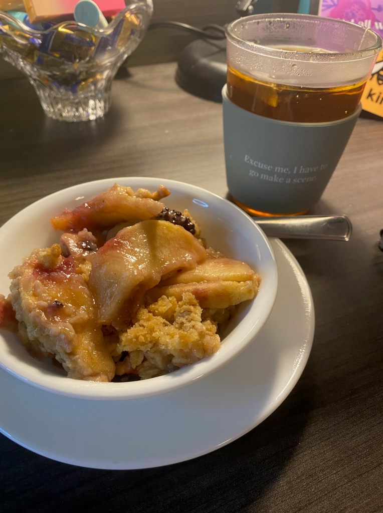 I normally take another quick break around 3, so I used this as the opportunity to eat some leftover apple-blackberry crisp and another cup of tea. This was actually a nice pick me up – I love sweets!