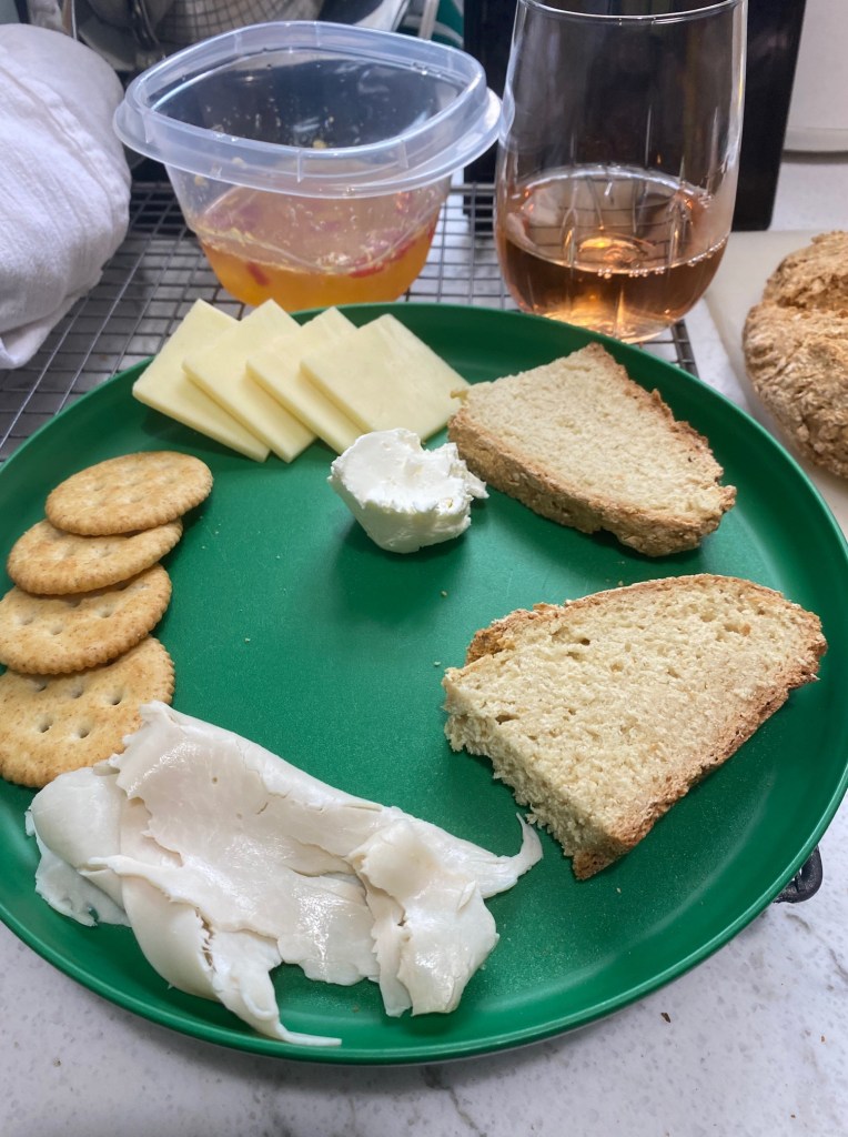I honestly thought about caving at this point. I was so full after all the other food, but still had 2 meals left to go. I decided to make this one an easy small meal with a charcuterie board of cheese, crackers, hot pepper jelly, deli turkey, soda bread, and a glass of wine.