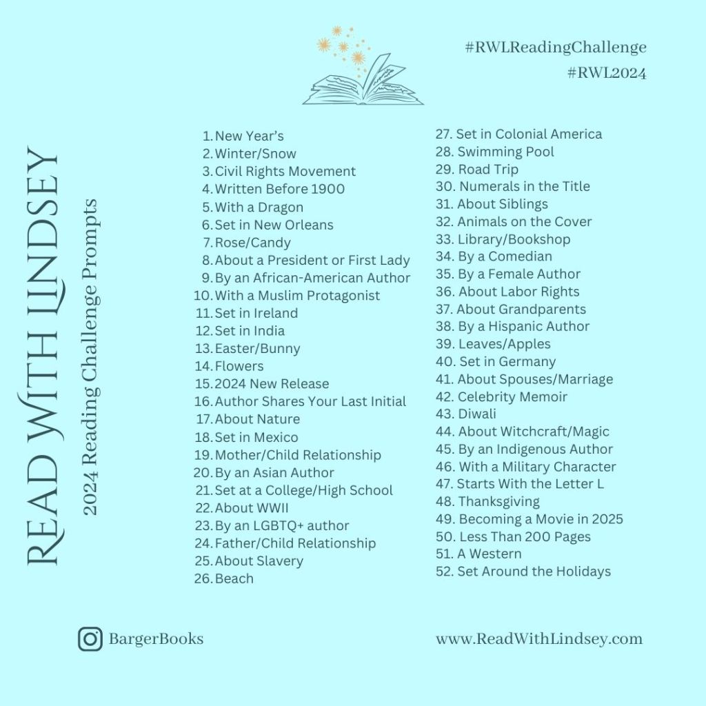 It’s Black Friday and I know a lot of you will be out there shopping the great sales (or online..IYKYK), so I thought today would be the perfect time to launch the Read With Lindsey 2024 Reading Challenge! Below you’ll find links to the full list of prompts for the year. To recap:
