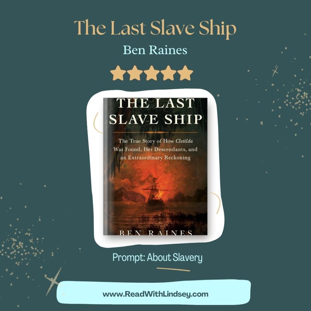 I chose The Last Slave Ship for the Read With Lindsey 2024 Reading Challenge prompt “about slavery” in honor of Juneteenth. Last year, I read Twelve Years a Slave about Soloman Northrup’s life as a slave after being wrongly kidnapped from his life as a free man in New York. I wanted to shift to a story about slaves kidnapped from overseas this year and wanted to read more about the citizens of Africatown. This book had so many great stories those citizens, but also the absurdity of the Meahers and their friends who thought they were above the law. I could not stop talking about this book while I was reading it – I hope you enjoy it as much as I did!