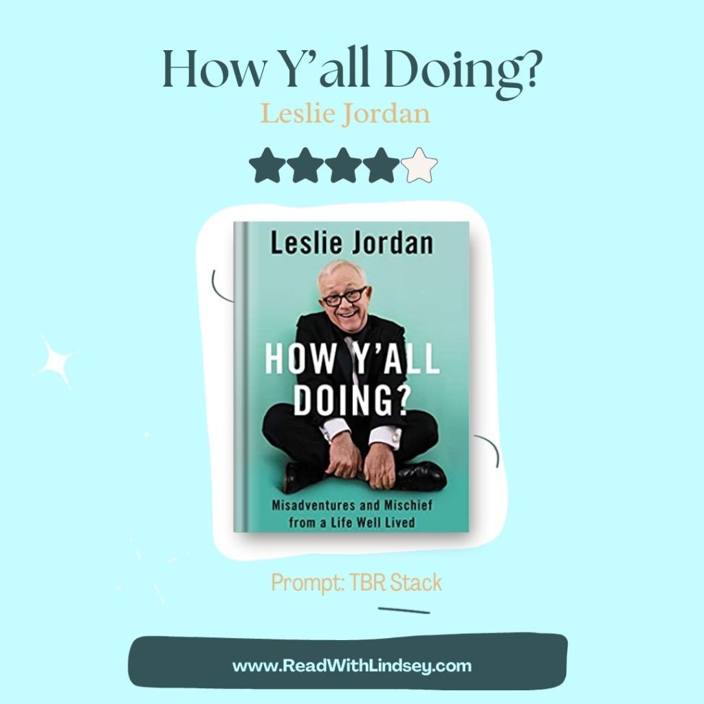 I give How Y’all Doing? 4 out of 5 stars. There are so many moments in this book that had me giggling, but it was the more serious moments and memories that really hit home for me. I appreciate the way Leslie shared openly about his journey in recovery and to find a comfortability with who he is. I will say my favorite tales were about his connection to Carrie Fischer and his time filming The Help, as well as his adventure throwing out the first pitch at a Nationals game!