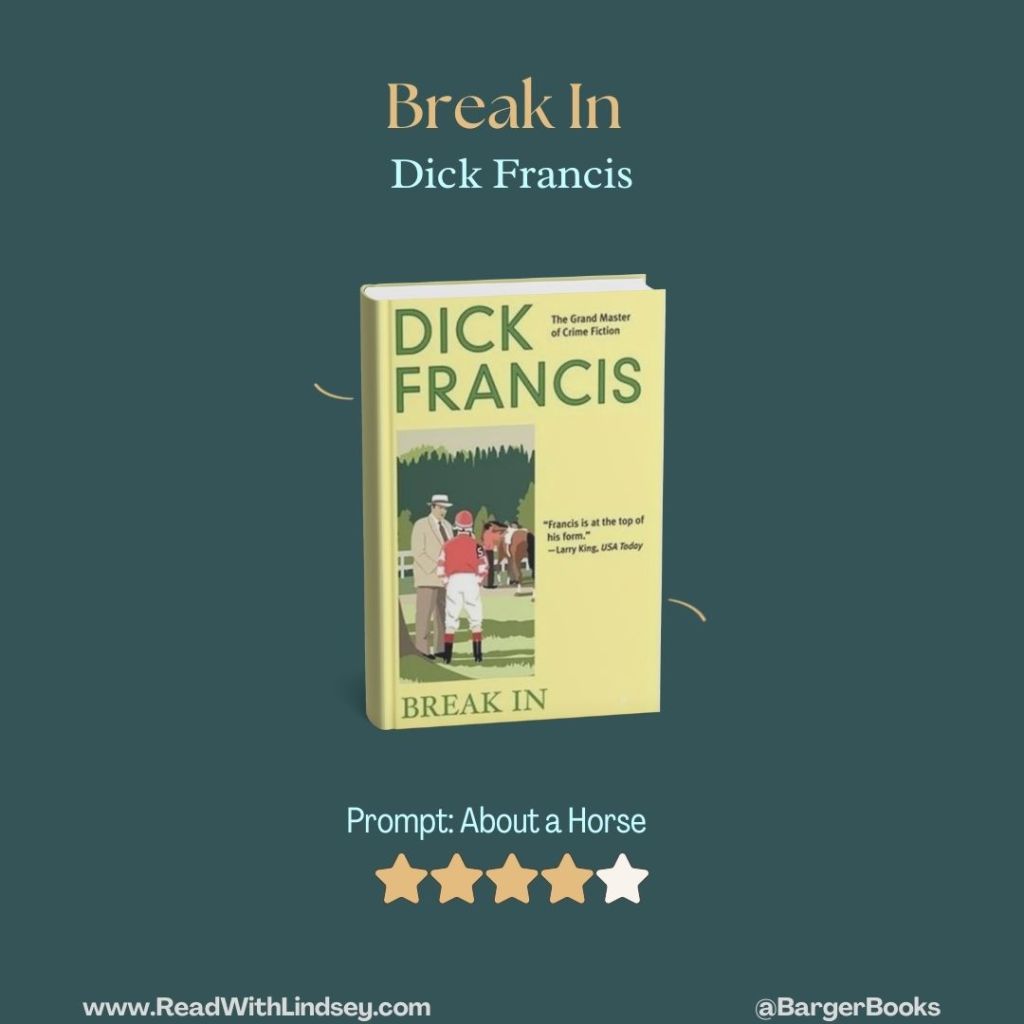 I give Break In 4 out of 5 stars. This was the first time I’d read anything from Francis, but it won’t be the last – I really liked this book! With a straight 4.0 rating, scoring 4’s in every category, I can tell you that I think Francis had room to improve his craft, but that he was already well on his way. He was mid-way in his career with this book, releasing it in 1985. There were some plot points that felt forced, but I loved the way Francis wove in not only the multiple aspects of a jockey’s life, but also the multiple aspects of horse racing, including American racing, too. I also like the respectful nature Francis takes with the romantic storyline of this book, too.