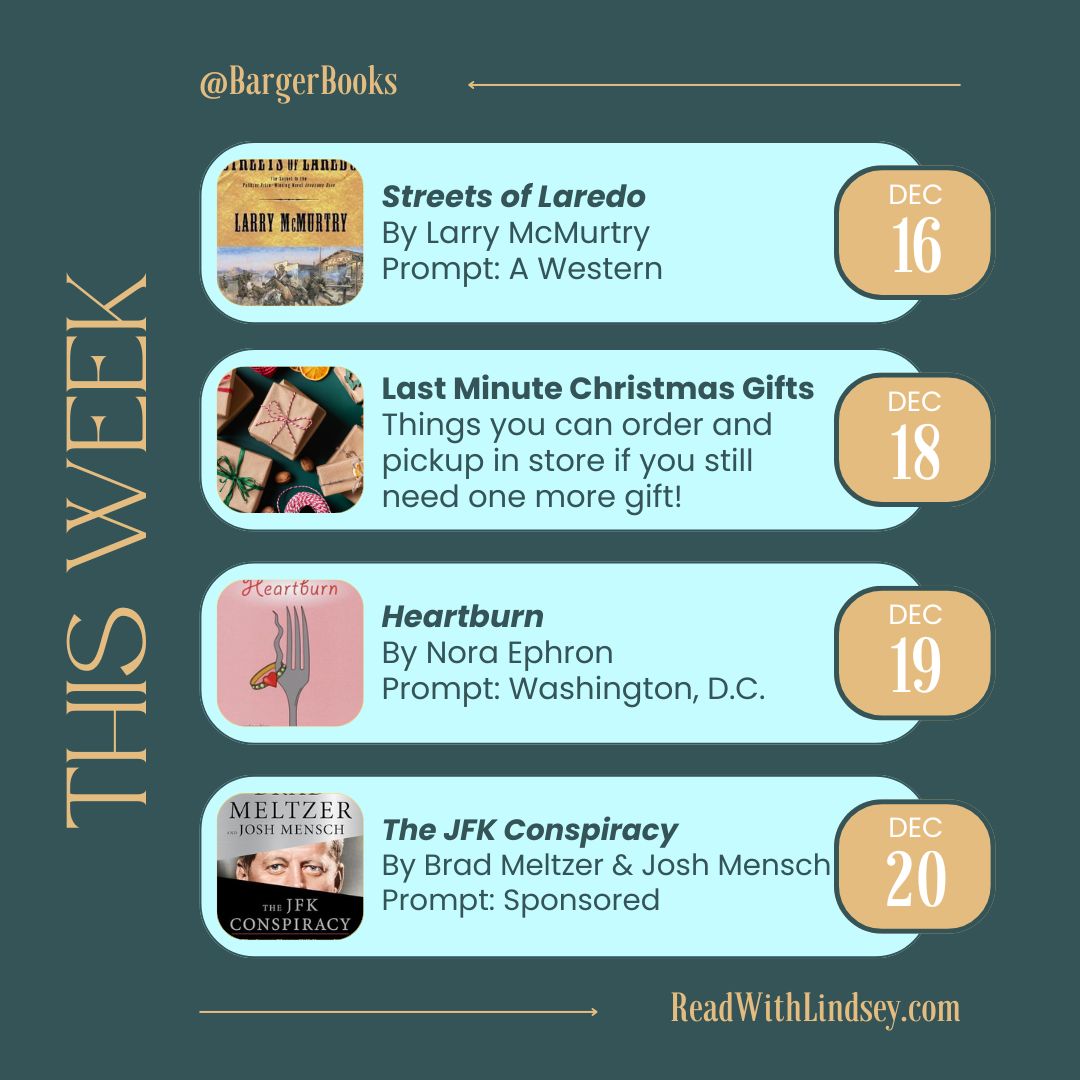 When I first started reading again as an adult, I was surprised to find how much I enjoyed a few genres like military/law enforcement thrillers, small town romance, and westerns. I'm pretty sure it all ties back to my childhood summers spent with my grandparents watching Gunsmoke and Bonanza or movies like McClintock! Not to … Continue reading This Week: December 15th